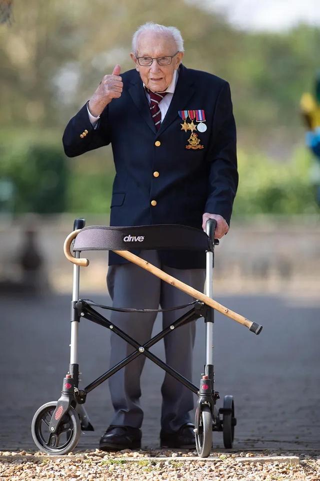 为了给NHS筹款,二战老兵摩尔上尉在100岁生日前,扶着轮拐在后花园走了100圈,最终募得超过3200万英镑。他后来获得女王授勋。