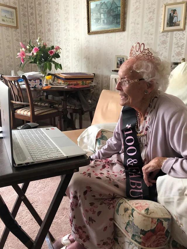 雷利的母亲和女王同一天生日。在100岁生日这天,她收到了女王送出的贺卡。图中,她在和家人举行线上生日会。