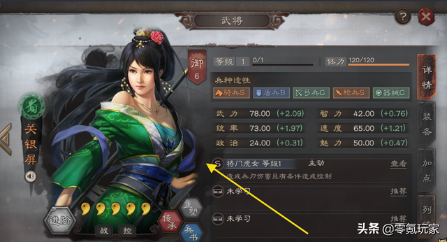 关银屏武力不算高,战法强力且复杂,不用着重于增加关银屏的伤害,只要让她打出战法就可以,队友造成伤害引爆"虎嗔"时就能造成额外150%伤害率的伤害,并且能够震慑敌人。